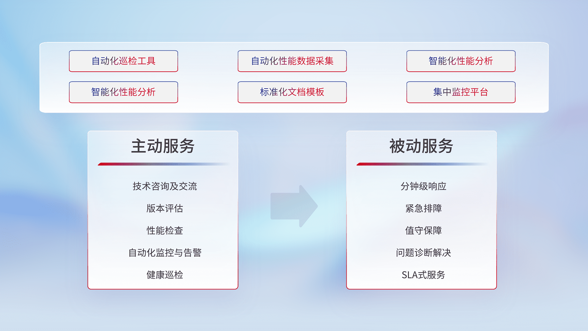 智能化工具和标准化文档,,,,保障服务质量,,,提供主动服务(包含技术咨询、、、、版本评估、、、、性能检查、、、、自动化监控与告警、、、、健康巡检)和被动服务包含(分钟级响应、、、紧急排障、、值守保障、、问题诊断解决、、、、SLA服务)。。