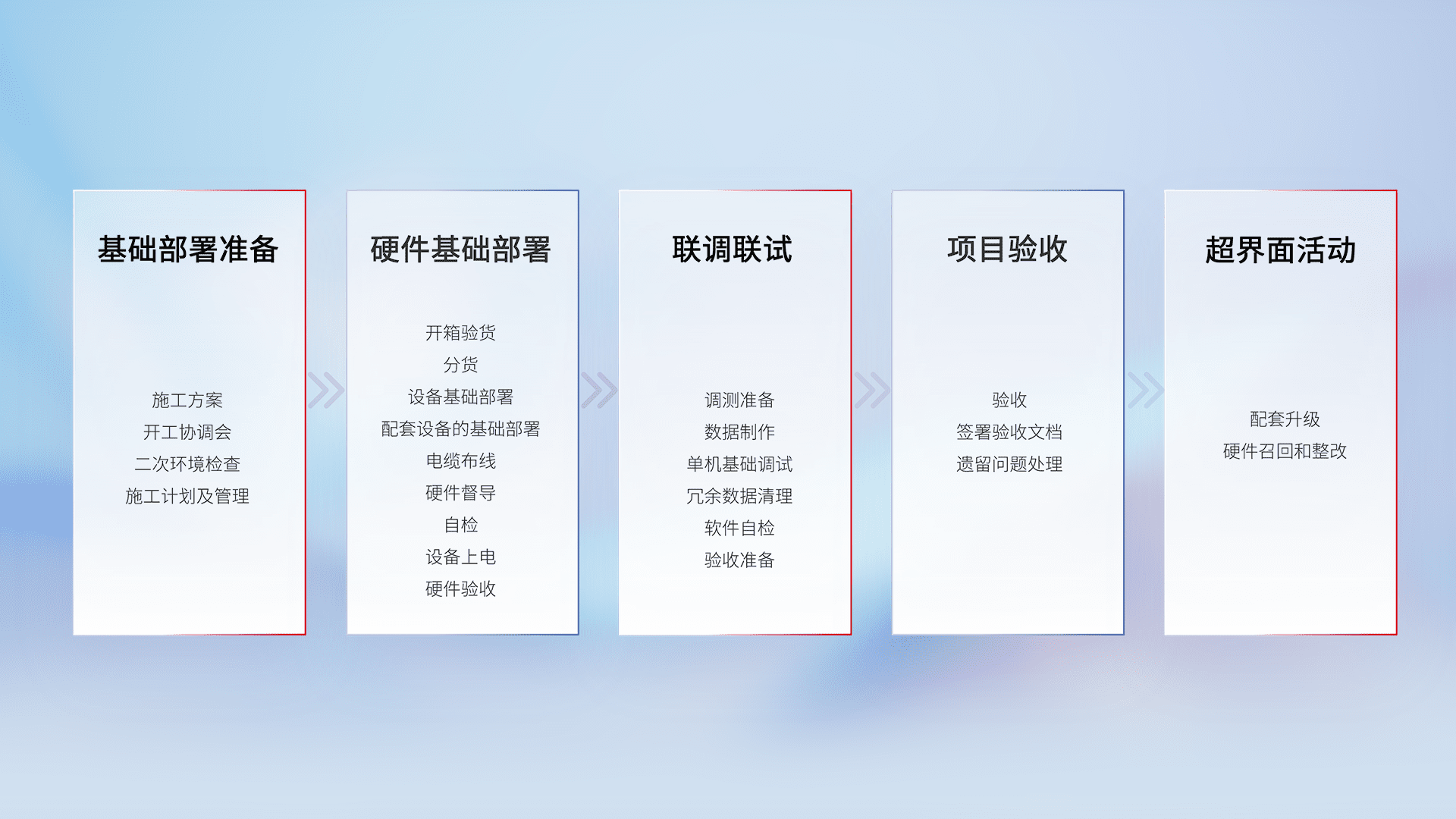从基础部署准备、、、硬件基础部署、、联调联试、、、、项目验收、、越界面活动的全过程可追溯,,,,保证施工质量和进度。。